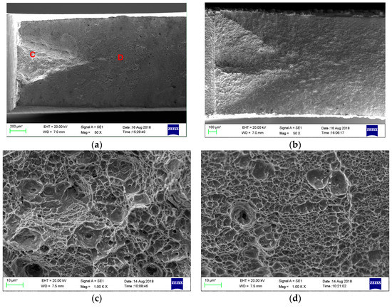 A detailed SEM examination of the fracture surfaces was carried out after the SSRT tests. As shown in Figure 10a,b, the low magnification fracture surface morphology is typical of notched specimens with a triangular region near to the notch, which is primarily connected with the stress intensification region [14,24]. Hydrogen-charging remarkably enlarged this area. As for the uncharged specimen, high magnification observation revealed a typical dimple ductile fracture comprising of dimples with different sizes in the triangular area (Figure 10c), while it is also a dimple ductile fracture with fine and uniform dimples, except a few large ones in the crack propagation region (Figure 10d).