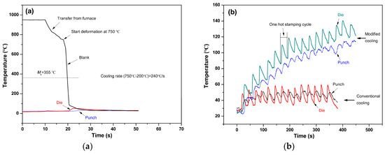 (a) Temperature evolution of blank and tools during the designed HS process of the tested steel and (b) temperature evolution of tools during continuous HS process.