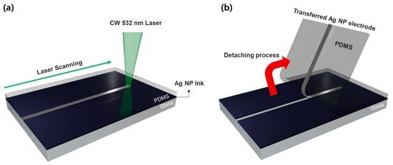 Laser processing is used in micromanufacturing for the fabrication of a wide range of devices, from micromechanical [14] to optical ones [15], and selective laser sintering (SLS) of metal nanoparticle (NP) ink is one of the relevant processes for transparent conductors that enables simultaneous patterning and sintering of metal NP ink for the creation of a metal electrode on either solid or flexible substrates [16]. In a typical procedure, first, metal NP ink is coated on the target substrate, and then the focused laser is scanned over the substrate to increase the local temperature for the selective melting and subsequent coalescence of the NP ink through the photothermal reaction. Being a direct writing method, metal electrodes are created selectively along the scanning path [6,17], and the feature size is mostly determined by the spot diameter of the focused laser, which can be reduced down to even the nanoscale using a tightly focusing lens. Since the fine structures at several micrometers become practically imperceptible to the naked eye, the metal electrodes produced by the SLS of metal NP ink are suitable for transparent conductor applications. At the same time, the minute control of laser parameters permits the application of the SLS process to even the most vulnerable polymer thin films such as polyethylene Terephthalate (PET) [17]. Therefore, various conductive electrodes have been successfully created by the SLS process on flexible substrates with silver (Ag) [6,18], copper (Cu) [19,20] and nickel oxide (NiO) [21] NP ink. On the other hand, the SLS of metal NP ink on elastomer substrates, such as polydimethylsiloxane (PDMS), still remains a challenging task due to the poor wettability of the PDMS substrate together with large discrepancies between the PDMS and the target metals with respect to their mechanical properties [22]. The SLS of metal NP on PDMS has been reported previously by Lee et al. using capillary-assisted laser direct writing (CALDW) [23], but multiple overlapping scanning procedures are required to ensure low sheet resistance, and the resultant metal electrode exhibits relatively large surface roughness, which hinders its application to other optoelectronic devices [24].