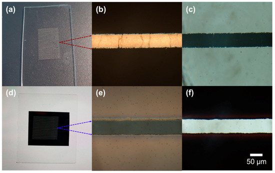 Optical images of (a–c) PDMS acceptor and (d–f) Ag NP ink donor on glass substrate; (a,d) Photographs; (b,e) Reflection optical microscope images; (c,f) Transmission optical microscope images.