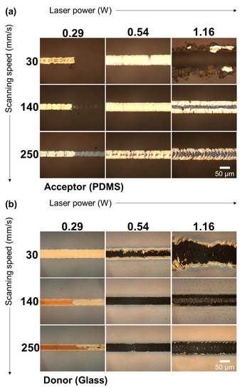 Combinatorial study for optimum laser power vs. laser scanning speed. Reflection optical microscope image of (a) the PDMS acceptor and (b) the Ag NP layer donor on a glass substrate.