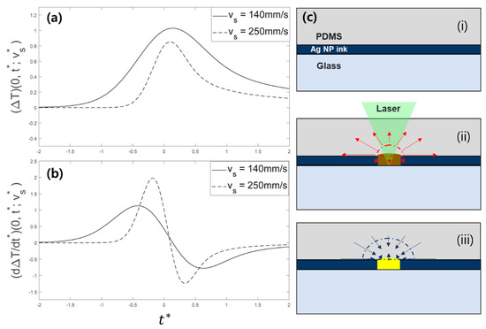 Laser-induced (a) temperature increase and (b) its gradient observed at a fixed point on the scanning path calculated from the heat equation for two different scanning speeds of 140 mm/s and 250 mm/s; (c) Schematics for the laser transfer mechanism: (i) Cross-sectional configuration of the system under concern; (ii) Laser-induced temperature increase initiates the sintering as well as the expansion of the PDMS layer; (iii) Subsequent cooling step causes contraction of the PDMS layer that assists the transfer of the sintered Ag NP.