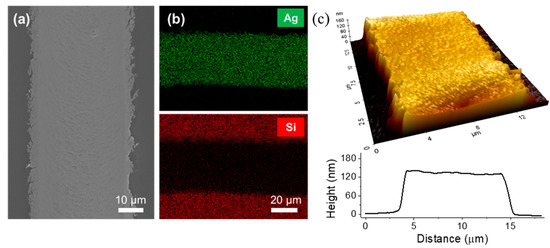 After the successful laser transfer, the Ag electrode on the PDMS film showed a continuous and smooth morphology, apart from a number of nanoscale zip-like cracks, as shown in the SEM image in Figure 5a. The associated energy dispersive spectrometer (EDS) measurements in Figure 5b further validate that only an insignificant amount of Ag NP ink was transferred from the contact without the laser scanning (refer to Supplementary Figure S4 for pointwise EDS measurements). For the atomic force microscope (AFM) measurement, the laser transfer was conducted with a 5× objective lens instead of a 2× objective lens in order to fit the final Ag electrode line into the scanning range of the AFM. From the AFM profile in Figure 5c, the height was measured to be ~150 nm, which was able to be further controlled by changing the spin-coating conditions. The resultant PDMS film with laser-transferred Ag electrodes may function as a simple form of a detachable electrode. To illustrate this concept, the resultant PDMS was attached to the glass substrate that was partially coated with platinum (Pt), as shown in Supplementary Figure S5. The as-deposited Ag NP ink layer shows negligible electrical conductivity, as shown in Supplementary Figure S5a, since Ag NPs exist as distinct particles. Upon laser transfer, which incorporates the sintering process, the resultant Ag NP exhibited electrical conductance after the laser treatment (Supplementary Figure S5b). Moreover, the PDMS film attached to the glass substrate without any adhesives due to its low mechanical modulus.