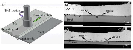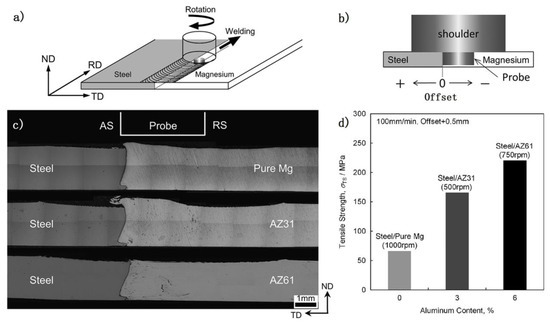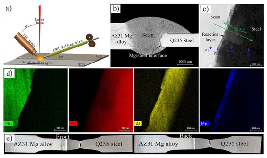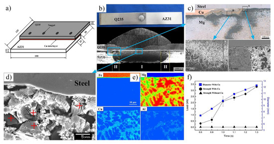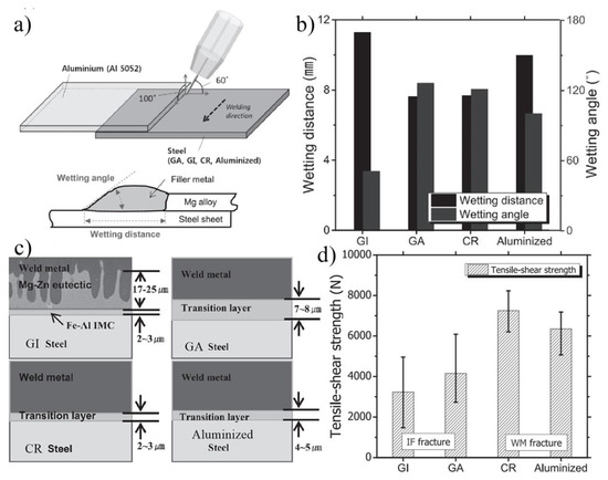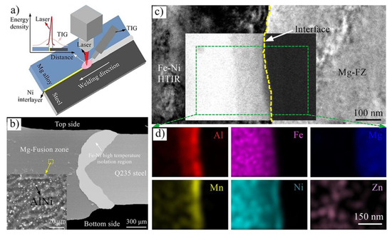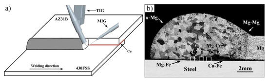 Mg alloy has gradually become a competitive new light structural material. It is now being widely used in the fields of electronic communication, automobile, and aerospace. Steel materials will continue to occupy a dominant position in the application of industrial production with the successful development of high-strength steel. Some steel structures were possibly replaced by lightweight metals because of the rapid increase of lightweight structural materials. The application of lightweight materials in the automotive industry has become common. Automotive companies are using lightweight materials to create better and more-developed automobiles. Dissimilar metal hybrid structures combine the advantages of two metals (such as Al/steel [1], Al/Mg [2], Al/Cu [3], Al/Ti [4], Ti/steel [5,6] and Mg/steel hybrid structures [7], etc), and can achieve the purpose of being lightweight while satisfying operating requirements.