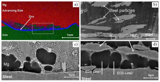 FSW Mg/Zn coated steel process [20] (a) EDX map of cross-section; (b) stir zone near Mg/steel interface; (c,d) enlarged drawing in (b).