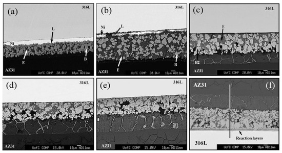 SEM micrographs of AZ31/Ni/316 L joint at 510 °C with different bonding time [27] (a) 3 min; (b) 5 min; (c) 10 min; (d) 20 min; (e) 30 min; (f) double stage bonding of 316 L/Ni/AZ31 with 20 min bonding time.