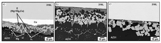 - Elthalabawy, W.M.; Khan, T.I. Eutectic bonding of austenitic stainless steel 316L to magnesium alloy AZ31 using copper interlayer. Int. J. Adv. Manuf. Technol. 2011, 55, 235–241. [Google Scholar] [CrossRef]