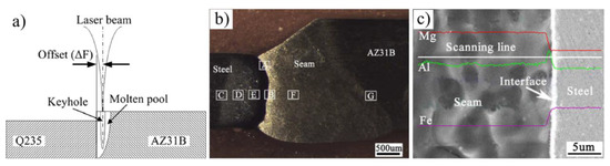 Laser offset welding of the AZ31/316 joint with 0.4 mm offset [35] (a) schematic diagram; (b) cross section of joint; (c) the microstructure near the Mg/steel interface.