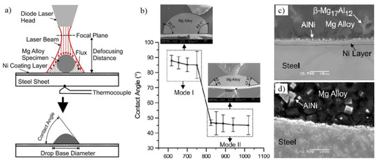 Nasiri et al. also studied the wetting characterization by measuring the contact angles of AZ92 Mg alloy on Ni-electroplated steel as a function of temperature [51], as shown in Figure 12. Reactions between molten Mg and Ni led to a contact angle of about 86 deg in the temperature range of 891 K to 1023 K (Mode I (Mg-lNi-Mg2Ni-Ni-Fe)), and AlNi + Mg2Ni reaction products were produced between Mg and steel. Only 46 deg contact angle was detected in the temperature range of 1097 K to 1293 K (Mode II (Mg-AlNi-Fe)).