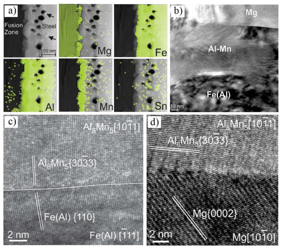 Laser welding of Mg/steel with Sn interlayer [45] (a) STEM-EDS concentration maps; (b) bright field TEM image of the Fe(Al)/Al8Mn5/Mg interfaces; (c,d) HR-TEM image of Fe(Al)/Al8Mn5 and Al8Mn5/Mg interface.
