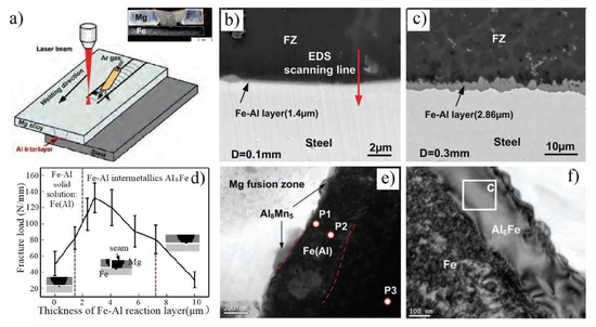 Laser-welding process of Mg to steel with the Al interlayer [44] (a) schematic diagram; (b,c) microstructure morphologies of interfacial reaction layers with 0.1 and 0.3 mm Al interlayer; (d) fracture load with a function of the thickness of the reaction layer; (e,f) TEM micrograph for reaction layer below/above 2 μm.