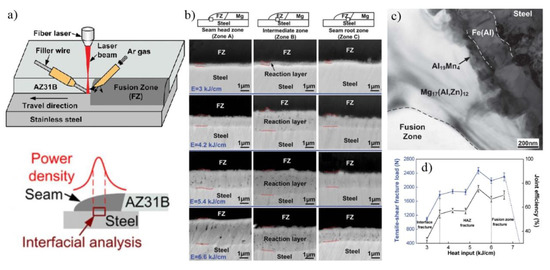 Laser welding-brazing AZ31B Mg alloy to 201 stainless steel sheet with a AZ31 Mg alloy filler wire is shown in Figure 15 [47]. The reaction layer has obvious changes with the increase of heat input, as shown in Figure 15b. The tensile test results indicate that the maximum results value was 2472 N (75.4% Mg base metal) at 5.4 kJ/cm heat input. Three different fracture modes were observed: Interfacial failure at a lower heat input, fusion zone fracture at a higher heat input, and Mg base metal HAZ fracture at a suitable heat input. Figure 15c shows a bright field image, which was taken at the Mg/steel interface at 5.4 kJ/cm heat input. A nanoscale and continuous layer was detected near the Mg/steel interface, which was composed of three layer: Mg17(Al, Zn)12, Al19Mn4 and Fe(Al) solid solution.