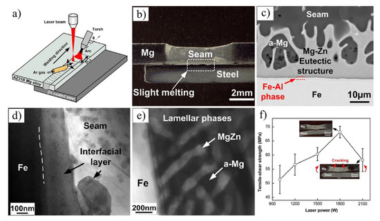 Mg/galvanized steel Laser-TIG hybrid welding process [66] (a) schematic diagram; (b) cross-section photograph; (c) interfacial microstructure morphologies at 1200 W; (d,e) bright field micrograph taken at the interface and the seam; (f) tensile-shear strength versus laser power.