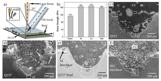 - Liu, L.M.; Qi, X.D.; Zhang, Z.D. The effect of alloying elements on the shear strength of the lap joint of AZ31B magnesium alloy to Q235 steel by hybrid laser-TIG welding technique. Metall. Mater. Trans. A 2012, 43, 1976–1988. [Google Scholar] [CrossRef]