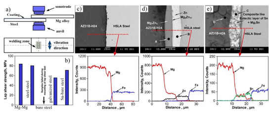 - Patel, V.K.; Bhole, S.D.; Chen, D.L. Characterization of ultrasonic spot welded joints of Mg-to-galvanized and ungalvanized steel with a tin interlayer. J. Mater. Process. Technol. 2014, 214, 811–817. [Google Scholar] [CrossRef]