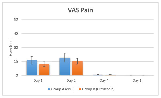 The level of intensity of the pain was collected at day 1 after surgery with a score of 16.33 ± 4.12 mm and was classified according to Visual Analog Scale (VAS) scores as mild pain, while at two days it was 19.22 ± 2.22 mm. The pain intensity at four days was significantly decreased, with a value of 0.92 ± 0.3 mm.