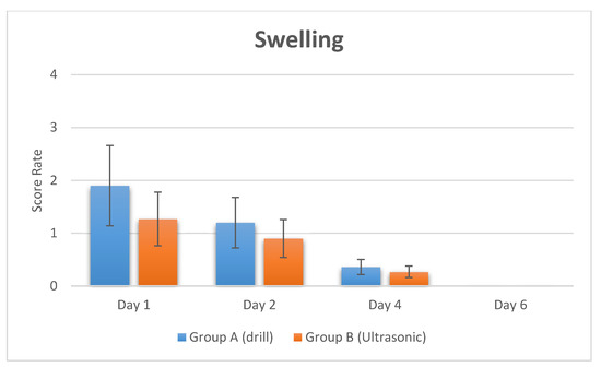 Swelling in post-operative times recorded by swelling score after implant treatment by Verbal rating scales (VRS).