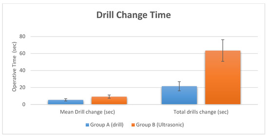 The surgical time required to perform and complete the implant site preparation procedures, excluding the time needed for changing the drills, was 2.5 ± 0.34 min. The time required for changing each drill was 5.5 ± 2.1 s for a total 21.5 ± 2.1 s (Figure 3 and Figure 4, and Table 2). Crestal bone resorption was 0.03 ± 0.001 mm after 3 months of healing (Figure 5 and Table 2).