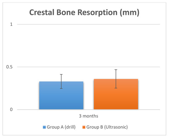 The surgical time required to complete the implant bed preparation procedures, excluding time needed for changing the tips, was 10.5 ± 3.1 min. The time required for changing each tip was 9.3 ± 3.2 s for a total 63.5 ± 2.1 s (Figure 3 and Figure 4, and Table 2). Crestal bone resorption was 0.036 ± 0.01 mm after 3 months of healing (Figure 5 and Table 2).
