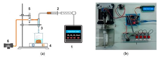 (a) Schematic diagram of the experimental equipment, used to prepare chitosan microspheres, developed in our lab: (1) electronic microcontroller, (2) injection zone, (3) dripper, (4) stirrer, (5) rotameter and (6) pump; (b) The magnification, items 1 and 2, of the experimental equipment, used to prepare chitosan microspheres.
