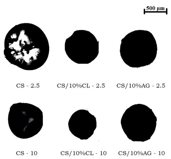 It is evidenced that the airflow rate of the drag system (2.5 and 10 L·min−1) affected the dimensions of the prepared microspheres. The diameter and volume of all microspheres (CS, CS/10%CL and CS/10%AG) decreased when they were manufactured with the higher airflow of the drag system (Table 1). According to Barbosa, et al. [38], the air rate flowing parallel to the needle is the main responsible for the drop drag, preventing their growth. Thus, the higher the airflow rate the larger the drag force, preventing the growth of droplet, resulting in a microsphere with smaller diameter.