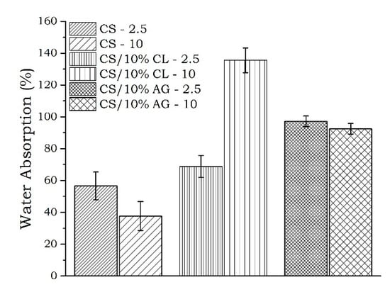 The water absorption data of the chitosan and chitosan/clay microspheres prepared at the airflow velocities of the 2.5 and 10 L·min−1 drag system is shown in Figure 5. The analyses were performed in triplicate and the results of this physical property was calculated as the average of three independent experiments and subjected to statistical analysis. The results were evaluated using analysis of variance (ANOVA) with Tukey’s test (p < 0.05) using Sisvar 5.6 and the statistical data are in Table 3.