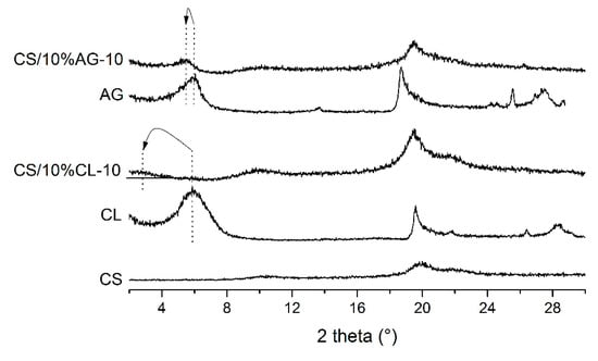Montmorillonite and bentonite clays (CL and AG), presented reflection peaks (001) with approximately 2θ at 5.90° and 6.02°, corresponding to a basal interplanar distance (d001) of 1.49 nm and 1.47 nm, respectively, characteristic of montmorillonite sodium [51]. After the incorporation of CL and AG within CS, the (001) peak of CL and AG moves to lower angles from 2θ = 5.90° to 2θ = 2.81° and from 2θ = 6.02° to 2θ = 5.47°, corresponding to a d001 value of 3.14 nm and 1.61 nm for CS/10%CL-10 and CS/10%AG-10, respectively. The increase in the interlayer distance for these nanocomposites was calculated from its corresponding d001. Considering the thickness of the montmorillonite layer of 0.96 nm [42], an increase of 2.18 and 0.65 nm in the interlayer spacing for the CS/10%CL-10 and CS/10%AG-10, respectively, was found, indicating the intercalation of bilayers of CS into the interlayers of CL and AG clays and the formation of an intercalated nanostructure. The higher value presented by CS/10%CL-10, suggests that the interlayers of almost all of CL clay were intercalated with bilayers of CS as described by Tan, et al. [52]. The intercalation of bilayer chitosan into the montmorillonite was also obtained by Darder, et al. [53], for chitosan to clay ratios of 5:1 and 10:1. This interaction was possibly favored by the electrostatic interaction of the second layer ( with the acetate ions of the chitosan solution, which allowed the access to the sites for anion exchange [26].