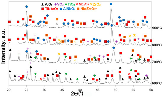 Figure 3 presents XRD patterns of the surface layers of the AlNbTiVZr0.25 alloy oxidized at 600, 700, and 800 °C for 100 h, and 900 °C for 50 h. In Table 2 the identified oxides and their lattice parameters depending on the temperature are listed. The surface layer of the sample tested at 600 °C was composed of the V2O5 (space group #59) [37], VO2 (space group #130) [38], TiO2 (space group #136) [39], Nb2O5 (space group #15) [40], and TiNb2O7 (space group #12) [41] oxides; the peaks from the V2O5 and VO2 oxides had the highest intensities. At 700 °C, in addition to the oxides observed at 600 °C, the ZrO2 (space group #14) [42], AlNbO4 (space group #12) [43], and Nb2Zr6O17 (space group #46) [44] oxides emerged; intensities of the V2O5 and TiO2 peaks were significantly lower in comparison with those at 600 °C. At 800 °C, the TiO2, V2O5, and Nb2O5 oxides were not detected and the surface layer consisted of the VO2 and ZrO2 (low-intensity maximums) and TiNb2O7, AlNbO4, and Nb2Zr6O17 (high-intensity maximums) oxides. At 900 °C, the VO2 and ZrO2 oxides were not detected, and the surface layer was comprised mainly of the complex TiNb2O7, AlNbO4, and Nb2Zr6O17 oxides. Note that the positions of the diffraction peaks from the oxides were very close to that expected from the literature data on their crystal lattice parameters (Table 2).