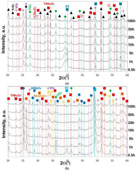 Figure 4 shows the XRD patterns of the surface layers of the samples tested for 0.5–100 h at 600 °C (Figure 4a) and 800 °C (Figure 4b). According to Figure 4a, the initial (0.5 h) stage of oxidation at 600 °C was associated with the formation of the TiO2 and VO2 oxides; strong diffraction peaks belonging to the B2 phase were also observed. Starting from 5 h exposure, tiny peaks of the V2O5, TiNb2O7, and Nb2O5 oxides were found. The intensity of the oxides peaks, especially V-rich, rose gradually as time progressed. After 20 h, the Braggs peaks of the B2 phase vanished. At 800 °C, the surface layer at the initial (0.5 h) stage of oxidation consisted of the VO2, TiO2, ZrO2, TiNb2O7, AlNbO4, Nb2Zr6O17 oxides and the B2 phase (Figure 4b). Increasing in time over 5 h resulted in the elimination of both the TiO2 oxide and the B2 phase from the diffraction patterns. Note that the annealing time had not affected the position of diffraction peaks.