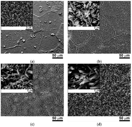 Figure 5 displays SEM-BSE images of the surfaces of the AlNbTiVZr0.25 alloy oxidized at 600 and 800 °C for 0.5 and 100 h. Table 3 shows the chemical compositions of the surfaces. The beginning (0.5 h) of the oxidation process occurred differently at 600 and 800 °C. At 600 °C (Figure 5a), the oxidation developed heterogeneously, which is evident from the discrepancy in the topographic appearance of different grains. In addition, very fine oxide nodules were found (magnified insert in Figure 5a). At 800 °C (Figure 5b), the oxidation affected all the grains homogeneously. The oxide whiskers with the average transversal size of ~500 nm were found at the surface (insert in Figure 5b). At 600 °C (0.5 h) the surface layer contained, besides oxygen, almost equal amounts of Al, Nb, Ti, and V, and was depleted of Zr (Table 3). Meanwhile, at 800 °C, the surface layer was predominantly composed of V and O (Table 3).