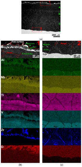 At 800 °C, the oxide scale was significantly thicker (~800 μm) and had a complex structure (Figure 7a). The top part of the oxide scale (#1 in Figure 7a,b) consisted of a (Al, Nb, V, Ti)-rich OL in a form of whiskers and a layer of mainly needle-shaped (Zr, Nb)-rich oxide particles. According to XRD data (Figure 3 and Figure 4b), the (Al, Nb, V, Ti)-rich OL could be identified as a mixture of the AlNbO4, TiNb2O7, and VO2 oxides, whereas the (Zr, Nb)-rich oxide particles—as the Nb2Zr6O17 oxides. A wide zone with the Ti- and V-rich OLs (“A” in Figure 7a; partly Figure 7b) was observed underneath of the top part; between and inside these OLs, multiple relatively small and separate large pores were found (Figure 7b). The next zone contained numerous relatively small and homogeneously distributed Nb2Zr6O17 oxide particles (“B” in Figure 7a). A thick layer with the regularly spread Nb2Zr6O17 oxide particles was situated directly below and expanding till the substrate (“C” in Figure 7a). The distribution of the particles in this layer was very similar to that of the Zr5Al3 particles in the substrate (see Figure 1b and Figure 7a).