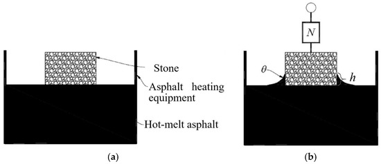 The hanging slice method was selected to measure the CA between hot-melt asphalt and aggregate. The testing principle is described as follows. Before the stone or aggregate touches the surface of hot-melt asphalt, the asphalt surface can be regarded as a horizontal plane. When the stone touches the asphalt surface, the hot-melt asphalt rises along with the stone to a certain distance because of the effect of surface energy and then forms a new asphalt surface, as shown in Figure 3. The testing temperature was 160 °C. The new asphalt surface tends to contract automatically, thereby leading to surface tension, which can be detected by using the dynamometer. The angle, θ, between the direction of surface tension and the stone surface denotes the CA between the hot-melt asphalt and stone. The relationship of the surface energy of hot-melt asphalt (γa), with the CA between the hot-melt asphalt and stone (θ) and the force value (N), satisfies Equation (1) as follows: