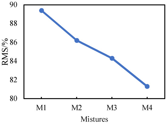 The adhesive energy between RCA and asphalt is less than that of serpentine according to the results of CA and adhesive energy. Therefore, the water stability of HMA-RCAs are worse than those of the traditional mixture. Figure 6 shows the RMS results of the four HMA-RCAs. The RMS values of M1, M2, M3, and M4 are 89.4%, 86.2%, 84.3%, and 81.3%, respectively. The RMS of HMA-RCAs decreases gradually as the RCA content increases because the adhesive energy between asphalt and RCA is less than that of limestone, and the CA between RCA and asphalt is greater than that of water. So, the asphalt spalls more easily from the RCA surface under water, resulting in a decrease in water stability of the asphalt mixture.
