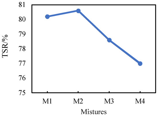 Figure 7 shows the TSR results. The TSR values of M1, M2, M3, and M4 are 80.2%, 80.6%, 78.6%, and 77.0%, respectively. The TSR of HMA-RCAs gradually decreases as the RCA content increases, which varies with the same law as that of RMS. When the RCA content is increased, the water stability of the asphalt concrete is generally weakened. However, it can be found from the TSR test results that when the RCA content was increased from 0% to 30%, the water stability of asphalt concrete was slightly increased by 0.4%, which may be due to experimental errors.