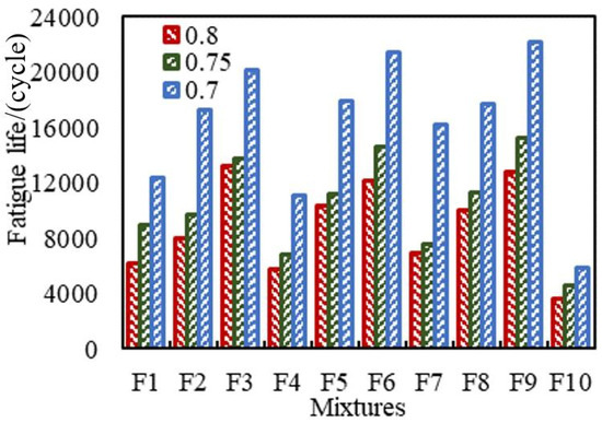 Table 10 shows the fatigue test result of HMA-RCA. It can be seen from Table 10 that as the stress level increases, the fatigue life of all standard trabecular specimens decreases rapidly. Moreover, as the RCA dosage increases, the fatigue life of the test piece also decreases significantly. When the content of RCA (F10) is 100%, the fatigue life of the test piece is only 30% of that of the ordinary aggregate test piece (F3; 6; 9). The fatigue life of standard trabecular specimens with different granite, serpentinite, limestone, and RCA contents under different stress levels is shown in Figure 8.