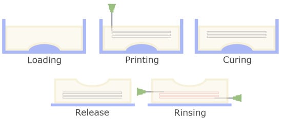 Schematic overview of the fabrication process for 3D structures. After the slurry is loaded into the mould, a channel pathway is printed using a fine nozzle. Then, the matrix is cured to create a homogenous, stable structure. Afterwards the device is released from the mould and the printed sacrificial material is removed by rinsing.