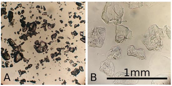 Microscopic image of gelatine granules when dry (A) and soaked (B) in 100 mM CaCl2 solution, compared to a reference bar of 1 mm.