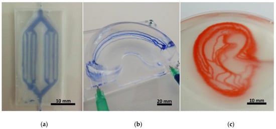 Perfusion test of the earlobe-shaped channel (Figure 3c) system at three different stages by manual injection of red ink (Pelikan 4001). (a) after initial injection, (b) half full channel system, (c) full channel system.