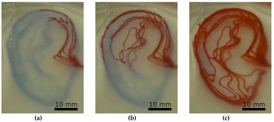 This demonstrates that this method is also useful with other polymers, which allow the fabrication of beads, increasing the range of applications. The FRESH method was already shown to produce vascular structures where vessel walls were fabricated, which; however, sets a limit on the resolution and fabrication complexity and finer vessels (≤1 mm) are difficult to manufacture in this manner. The proposed method allows fabricating vessels with a diameter comparable to the nozzle. Using gelatine granules and G27 nozzles (0.21 mm inner diameter, 0.41 mm outer diameter), 0.6 mm thick vessels could be produced, which should be optimized by improving matrix composition. By increasing the range of materials which can be used with this technique, diffusion and other properties will be possible to regulate. The described method allows the fabrication of microfluidic devices from any hydrogel which allows fabrication of beads/granulate in the appropriate range of particle-size ≤300 µm. Internal channel pressure was not measured in this work; however, we did observe a certain variation in flow velocity between channels in the ear-lobe shaped device. This can be explained by varying channel pressures which according to Hagen–Poiseuille’s law arise due to differences in channel length. To confirm this and produce a more detailed analysis of flow behaviour inside channels which were fabricated in the described manner, we suggest the use of a controlled pumping system, coupled with visual analysis for obtaining quantitative data.
