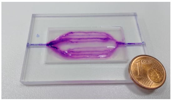 Alginate-based microfluidic device in the shape of 2D branched structures. Perfusion was tested using violet ink (Pelikan 4001), residues of which are visible in the photograph. The same sample frame and fabrication parameters were used here, as shown in Figure 3a.
