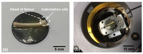 (a) Bone mounted on a steel plate with the femoral head pointing vertically for indentation, (b) Specimen mounted within the Hysitron in-situ nanomechanical testing rig.