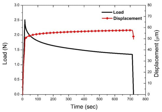 The indentation sequence is illustrated in Figure 3a with the load and displacement curves recorded shown in Figure 4. The load was linearly incremented from 0 to a maximum of 2.5 N, since at this point the displacement sensor limit was reached and the sensor saturated, leading to a significant drop in load and a slight increase in displacement during the hold segment (Figure 4).
