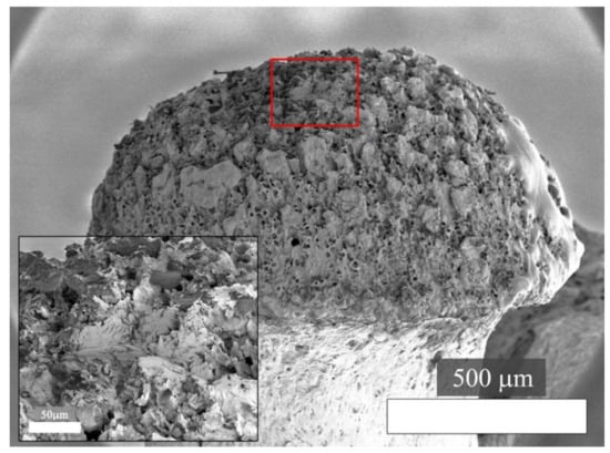 Secondary electron SEM image of the indentation residual imprint location on the femoral head and higher-magnification of the indentation (inset) at 1 kV with a tilt angle of 45°.