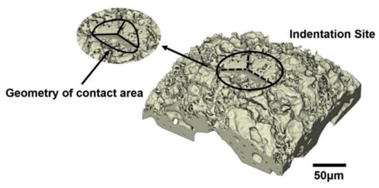 Due to the heterogeneous microstructure of bone [24], as illustrated in Figure 3b, the selection of the indentation site is essential [25] in determining the mechanical response and the inferred properties such as hardness and elastic modulus [26,27]. One other factor that needs to be considered in terms of indentation testing is the size of the indenter [28]. The inferred mechanical properties of the bone are likely to depend on the indent size due to the scale of the microstructural features such as pores and cracks within the bone structure sampled during the indentation process [29]. In the present study, the indent size is not a critical concern since the main focus of the study is to generate and visualise sub-surface crack networks to understand the crack propagation and fracturing behaviour of bone rather than to examine the mechanical properties (e.g., hardness and modulus) by implementing indentation under X-ray CT.