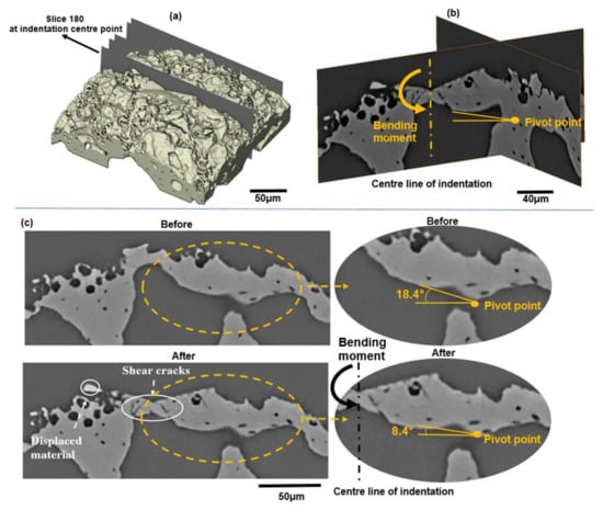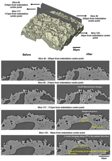 Figure 7 shows a 3D image of the indentation site and also the geometry of the contact area formed during the indentation. This indicates a material pile-up behaviour [30]. It has been reported that pile-up of material on the indentation site may occur when using a sharp Berkovich indenter [9,31,32]. However, the amount of pile-up is limited, as seen in Figure 7, since bone has a relatively low effective modulus-to-yield stress ratio in compression [32]. Although the plastically deformed indentation site and limited pile-up can be seen through the volumetric rendering of the indentation site given in Figure 7, it is not possible to identify the sub-surface damage mechanisms such as splitting, cracking and plastic deformations induced by the indentation. Therefore, individual virtual cross-sectional slices (orthoslices) at different distances have been used to identify these damage modes and to understand the fracture mechanics of bone. This is challenging due to the complex and hierarchical structure of bone [33]. Figure 8 shows the individually rendered cross sections at large distances away from the indentation site and near the indentation site. Small dimensional changes through the movement of small pores in the bone microstructure are visible at a distance of 214 µm from the indentation site (slice 60) while no visible changes can be observed at a distance of 250 µm (slice 40).