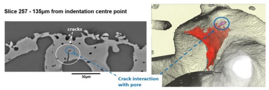 Figure 8 shows various damage mechanisms including visible plastic strain and crack initiation and propagation through the virtual cross-sectional slices near the indentation site (slices 117 and 125). Fine cracks and the displacement of pores can be identified at a distance of 113 µm (slice 117) while crack formation and growth at an angle of approximately 45° to the indentation direction can be observed nearer to the indentation site (slice 125). Crack bridging is one of the major mechanisms that inhibits crack extension in bone tissue [34] and can occur when a crack grows from the indent [27]. Here the cracks along the direction 45° to the indentation direction show some slight evidence of crack bridging (Figure 8 slice 125) which may lead to a decrease in the driving force at the crack tip through the interaction between the cracks and the microstructural features [35]. Some interactions between the propagating cracks and the pre-existing pores and micro-cracks are also visible in slices 117 and 125. Although it is clear that the pore networks in the bone structure affect the mechanical behaviour of bone [36], it is currently unknown how important these pores are in preventing crack propagation and increasing the fracture resistance by contributing to toughening mechanisms such as microcracking, crack bridging, and crack deflection [10,15,16,35]. Haversian canals have an important role in the crack propagation behaviour of human cortical bone (specifically crack deflection) [15], however, they have been reported as ‘not found’ in mouse bone, and in any case not in trabecular bone [7]. Thus, the interconnectivity of pores and cracks may have a relatively strong effect on the fracturing of mouse bone compared to human bone. In order to better understand the effects of the pre-existing pore networks on the crack propagation, the interaction of cracks with pores and fine trabecular structure is visualised and discussed in detail through 2D and 3D visualisations in the following sections.