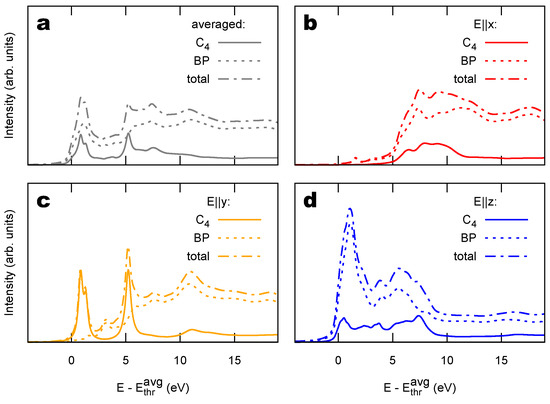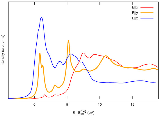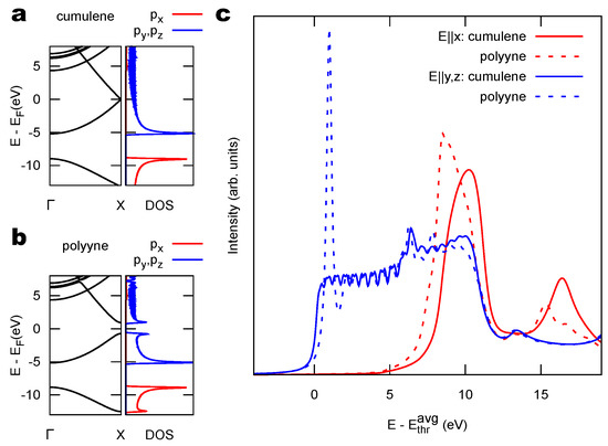 Figure 1c reports the NEXAFS spectrum simulated in the half-core-hole approximation [45], for different photon polarizations, i.e., different directions of the photon electric field : along the C chain axis (x) and perpendicular to it (y and z). We recall that these calculations are based on pseudopotential methods and as such the energies, not including the core-level binding energy, are referred to the average C 1s ionization potential (see Section 4). Both structures exhibit a peculiar dependence on the polarization direction (dichroic signal): in the lower-energy near-edge region (0–5 eV in the plot) only orbitals are available as final states for the electronic excitation. These originate from the C 2p states and, given the dipole selection rule with a C 1s initial state, they can only be excited by the photon field along y and z (blue curves). At higher energy, also states with character (hybrid 2s and 2p) can be excited with the photon field along the chain axis (red curves).