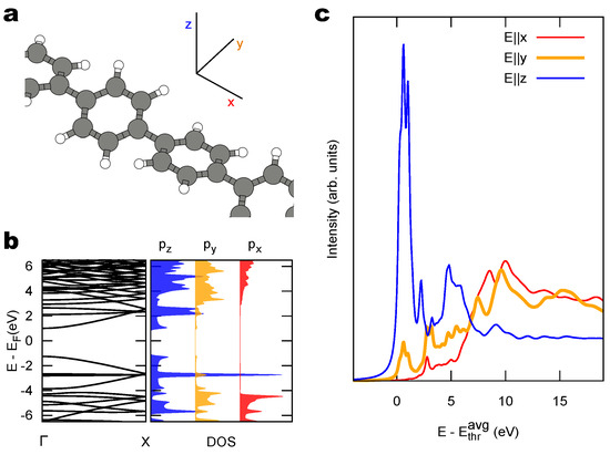 To address the properties of sp/sp structures we first analyze a pure sp polymer. Hence, as a prototype of NEXAFS dichroism in a sp system, we take poly(p-phenylene) (PPP), which is composed of repeated phenyl units and can be obtained by the polymerization of benzene [57]. Like in biphenyl and substituted biphenyls [58], the structure is stabilized by twisting adjancent phenyl units around the axis. We adopt here as a model structure a quasi-planar arrangement of the polymer, with two phenyl rings at from a reference plane, as determined by DFT: this model, depicted in Figure 2a, is both computationally more feasible and more representative of adsorbed molecules and polymers (discussed in the next paragraphs), than a helical arrangement having the twist angle of phenyl units increasing monotonously. Figure 2b reports the electronic band structure and the DOS projected on C 2p states. The PDOS shows the dominant character of the frontier orbitals originating from atomic p states. Given the tilt of the aromatic rings, some contribution to those states is computed also for atomic orbitals with p symmetry, but truly states associated to p and p orbitals are only found farther away from the Fermi level.