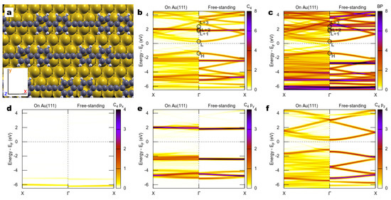 (a) Structural model of bBEBP/Au(111). (b,c) Electronic band structure projected on the C atoms belonging to the C section and the biphenyl one, respectively. Left and right panels report the calculations on Au(111) and free-standing, respectively. Darker colors indicate stronger localization over the C atoms, whereas white area denote the absence of electronic state projecting over the selected set of orbitals at that energy. The labeled circles mark the energy of highest occupied (H) and lowest unoccupied (L) electronic states, computed for the free-standing polymer, depicted in Figure 4. (d–f) The same band structure projected on the , , and orbitals of the C part.