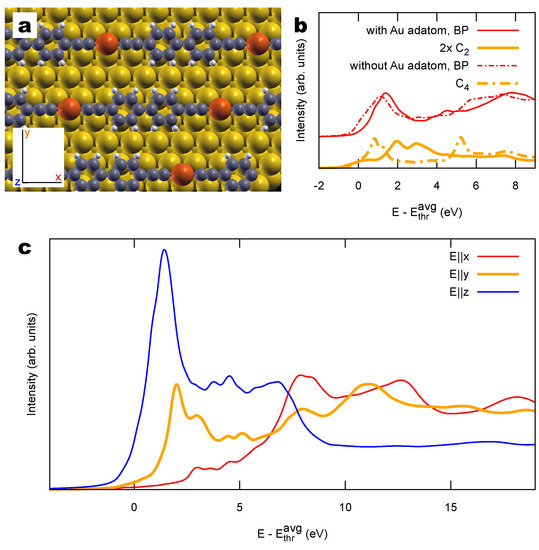 To discuss the generality of the results presented for bBEBP/Au(111), we consider two different structural models. First we take the case of an intermediate stage in the formation of bBEBP/Au(111). This results from the dehalogenative homocoupling of the precursors, leaving to an organo-metallic compound where Au adatoms are embedded into polymer units. A subsequent thermal annealing would then remove the Au adatom from the intermediate structure and generate the bBEBP/Au(111) analyzed in the previous section [30]. To model the intermediate compound we consider the insertion of one Au adatom in our supercell, resulting in a longer one, and optimize the structure as discussed in Section 4. We consider the same alignment of the polymer relative to the substrate crystallographic directions as for the final product (cf. Figure 3a) and obtain a flat-lying and slightly elongated polymer depicted in Figure 7a. The presence of the Au atom influences only minimally the contribution by the BP part to the NEXAFS spectra, as shown by the averaged spectra in Figure 7b. Instead, the sp section, now only consisting of extremely short C fragments, gives a strongly modified spectrum. In particular, as can be seen by inspecting the full polarized spectrum shown in Figure 7c, the peaks seen in y-polarization are now at slightly larger energy than those seen in z-polarization, at variance with the result of the final polymer seen in Figure 5 where an opposite energy alignment is observed. This can be explained by the widening of the HOMO-LUMO gap as the linear chain shortens, bringing the LUMO at higher energy. Nevertheless, the full spectrum shown in Figure 7c still reports a significant polarization dependence and emergence of a low-energy signal for in-plane directions. Additional detail about these spectra is provided in the Supplementary Materials, Figures S2 and S3.